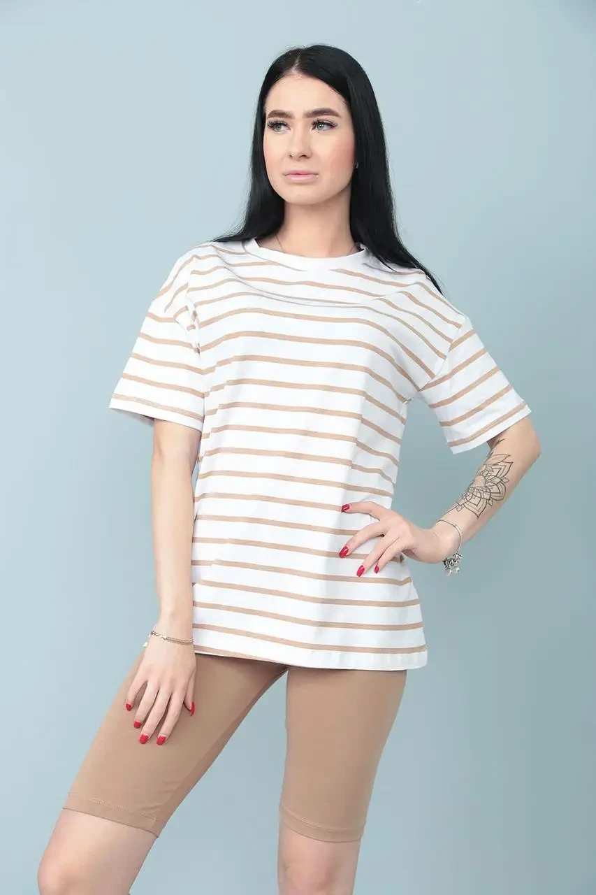 Жіночий літній костюм з велосипедками та смугастою футболкою "Balance" капучино